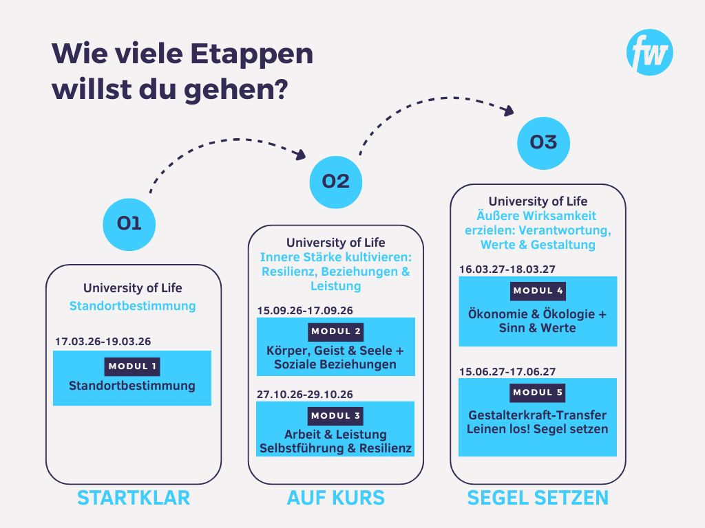 Insgesamt kannst du also bis zu ein Jahr mit uns unterwegs sein. Alle Module kombinieren Live-Online-Calls mit Präsenztagen am Bodensee.