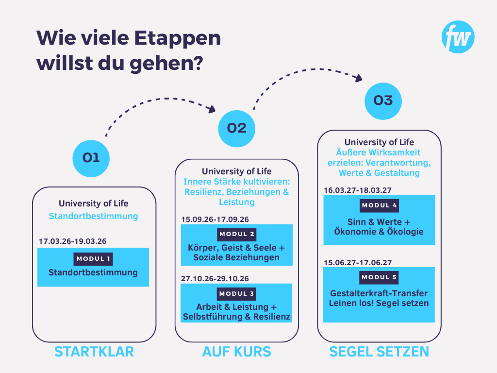 Du entscheidest selbst, wie weit du gehen willst. Start ist immer die „Standortbestimmung“, danach legst du fest, ob und welche weiteren Etappenziele du erreichen willst.